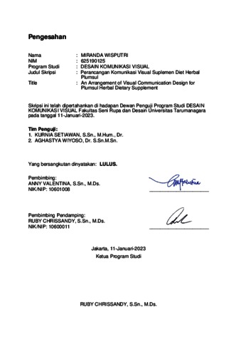 Wisputri, Miranda (2023) Perancangan komunikasi visual sebagai media promosi suplemen diet herbal Plumsul (DKV - 3030). Skripsi thesis, Universitas Tarumanagara.