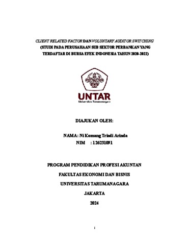 Arinda, Ni Komang Triadi (2023) Client related factor dan valuntary auditor switching (studi pada prusahaan su sektor perbankan yang terdaftar di Bursa Efek Indonesia tahun 2020-2022. Masters thesis, Universitas Tarumanagara.