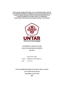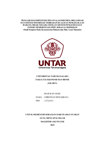 Dewabrata, Christian (2023) Pengaruh Kompetensi Pegawai, Komitmen Organisasi dan Sistem Informasi Terhadap Kualitas Pengelolaan Barang Milik Negara dengan Sistem Pengendalian Intern Pemerintah (SPIP) Sebagai Moderasi (Studi Empiris Pada Kementrian Hukum dan Hak Asasi Manusia). Masters thesis, Universitas Tarumanagara.