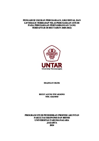 Wicaksono, Ricky Agung (2023) Pengaruh perusahaan, likuiditas, dan leverage terhadap nilai perusahaan (studi pada perusahaan pertambangan yang terdaftar di BEI tahun 2020-2022). Masters thesis, Universitas Tarumanagara.