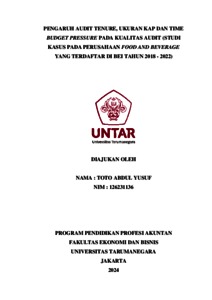 Yusuf, Toto Abdul (2023) Pengaruh audit tenure, ukuran KAP dan Time Budget Pressure pada kualitas audit (studi kasus pada perusahaan food and beverage yang terdaftar di BEI tahun 2018-2022). Masters thesis, Universitas Tarumanagara.