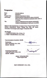 Angelia, Celine (2024) Perancangan komunikasi visual edukasi bipolar untuk orangtua dengan anak usia 12-16 tahun (DKV - 3047). Skripsi thesis, Universitas Tarumanagara.