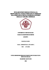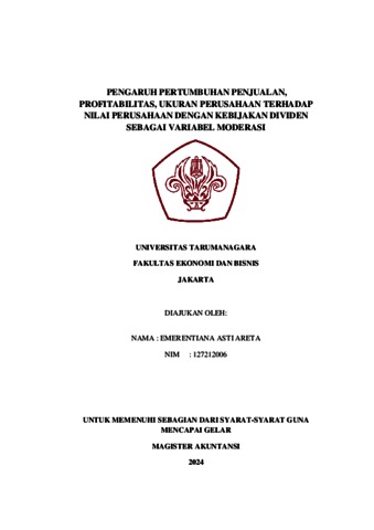 Areta, Emerentiana Asti (2023) Pengaruh Pertumbuhan Penjualan, Profitabilitas, Ukuran Perusahaan Terhadap Nilai Perusahaan Dengan Kebijakan Dividen Sebagai Variabel Moderasi. Masters thesis, Universitas Tarumanagara.