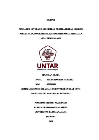 Sachio, Richardo Rizky (2023) PENGARUH LEVERAGE, LIKUIDITAS, PROFITABILITAS, UKURAN PERUSAHAAN, DAN KEPEMILIKAN INSTITUSIONAL TERHADAP NILAI PERUSAHAAN. Skripsi thesis, Universitas Tarumanagara.