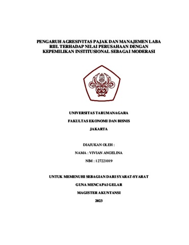 Angelina, Vivian (2023) Pengaruh Agresivitas Pajak dan Manajemen Laba Riil Terhadap Nilai Perusahaan dengan Kepemilikan Institusional sebagai Moderasi. Masters thesis, Universitas Tarumanagara.