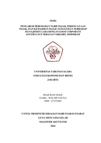 Guna, Welvin I (2023) Pengaruh Perubahan Tarif Pajak, Perencanaan Pajak, dan Kewajiban Pajak Tangguhan Terhadap Manajemen Laba dengan Good Corporate Governance Sebagai Variabel Moderasi. Masters thesis, Universitas Tarumanagara.