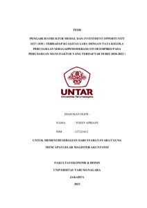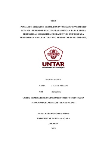 Afriani, Yossy (2023) Pengaruh Struktur Modal dan Investment Opportunity Set (IOS) Terhadap Kualitas Laba dengan Tata Kelola Perusahaan Sebagai Moderasi (Studi empiris. Masters thesis, Universitas Tarumanagara.