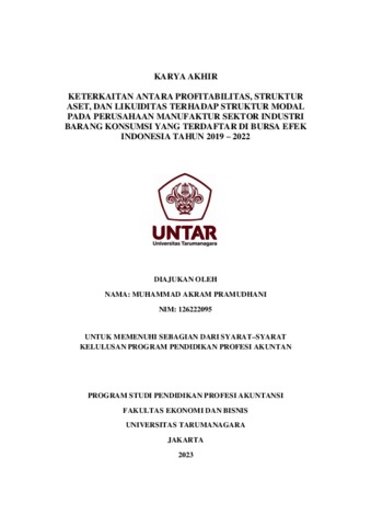 Pramudhani, Muhammad Akram (2023) Keterkaitan antara profitabilitas, struktur aset, dan likuiditas terhadap struktur modal pada perusahaan manufaktur sektor industri barang konsumsi yang terdaftar di Bursa Efek Indonesia tahun 2019-2022. Other thesis, Universitas Tarumanagara.