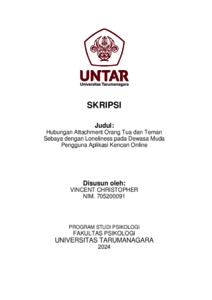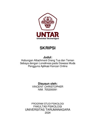 Christopher, Vincent (2024) Hubungan Attachment Orang Tua dan Teman Sebaya dengan Loneliness pada Dewasa Muda Pengguna Aplikasi Kencan Online. Skripsi thesis, Universitas Tarumanagara.