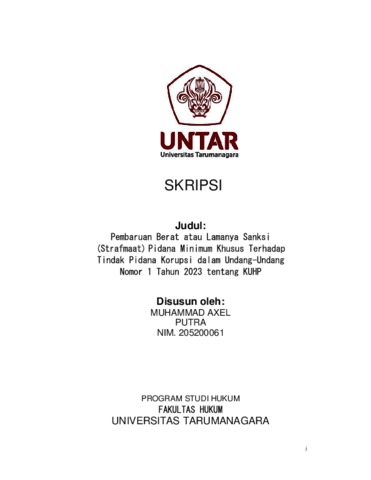 Putra, Muhammad Axel (2024) Pembaruan Berat atau Lamanya Sanksi (Strafmaat) Pidana Minimum Khusus terhadap Tindak Pidana Korupsi dalam Undang-Undang Nomor 1 Tahun 2023 tentang KUHP. Skripsi thesis, Universitas Tarumanagara.