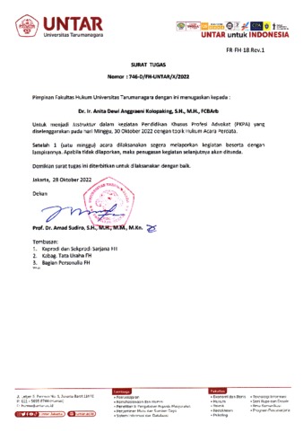 Kolopaking, .Anitia, Dewi Anggraeni Surat Tugas Nomor: 746-D/FH-UNTAR/X/2022. ..