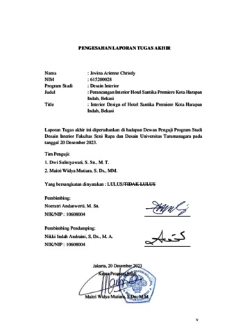 Christly, Jovina Arienne (2023) Perancangan interior Hotel Santika Premier Kota Harapan Indah, Bekasi (DI - 2466). Skripsi thesis, Universitas Tarumanagara.