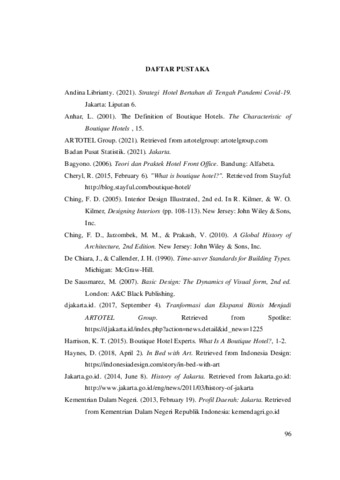 Abstrak - Merupakan salah satu dari banyaknya sarana pelayanan jasa berupa penginapan. Seiring berkembanganya zaman, hotel yang biasa digunakan sebagai tempat hunian sementara untuk berlibur, sekarang digunakan sebagai tempat pertemuan bisnis dan masih terus berkembang. Passion yang menjadi salah satu ciri khas generasi milenial mulai mendasari beberapa konsep perancangan hotel, salah satu passion generasi milenial yang mendasari konsep sebuah hotel adalah art. Menggabungkan art dengan hospitality, ini adalah hal yang dilakukan Artotel Thamrin Jakarta. Menjadi wadah bagi generasi milenial dalam berkarya dan menawarkan fasilitas dengan kualitas yang baik dan mendukung fasilitas MICE di Indonesia. Desa in interior mempunyai peranan penting dalam menciptakan suasana yang menarik dengan memperhatikan kebutuhan fa silitas ruang melalui analisis aktivitas pengunjung dan juga pengelola. Dengan menganalisi citra serta aspek a spek lainnya, konsep tema yang akan diangkat pada perancangan interior Artotel Thamrin Jakarta ini adalah "NEWFANGLED; nu: fæŋ.gǝld/", yang artinya “recently made for the first time, but not always an improvement on what existed before", dimana hotel yang menjadikan art gallery. Memberi experience yang baru bagaimana art gallery yang baik di Indonesia yang memiliki pengertian sebagai wadah baru yang mewadahi generasi – generasi milenial dalam berkarya dan melihat hal – hal lainnya melalui kacamata yang berbeda, tertutama seni. Semua hal yang berada dalam hotel ini merupakan objek pamer yang menjadikan hotel ini seperti sebuah kanvas.