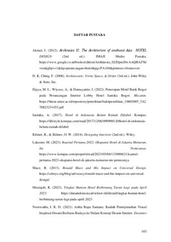 Hotel merupakan jasa akomodasi yang menyediakan layanan penginapan, penyedia makanan dan minuman, dan fasilitas tertentu yang diperuntukkan untuk masyarakat umum. Jenis tujuan kunjungan ke hotel tersebut beragam, seperti kunjungan bisnis, wisata, social event, dll. Bangunan hotel sebagai fasilitas publik yang bersifat umum memiliki beragam jenis tamu, salah satunya penyandang kursi roda. Sebagai tamu hotel, mereka memiliki hak dan kesetaraan yang sama untuk menikmati fasilitas hotel. Orang dengan pengguna kursi roda merupakan salah satu penyandang yang dapat banyak ditemukan di mana saja, namun hanya 11 % hotel di Indonesia yang ramah bagi penyandang disabilitas. Hotel Santika Premiere Kota Harapan Indah (KHI) Bekasi merupakan salah satu hotel terbaik berbintang 4 yang berada di Bekasi. Sebagai hotel yang memiliki nama cukup besar dan terkenal, perancangan Hotel Santika Premiere KHI Bekasi bertujuan untuk mengimplementasikan prinsip Desain Universal pada interiornya. Banyak bisnis hotel bersaing dalam menjaga eksitensinya, sehingga melalui perancangan ini diharapkan mampu menjaga brand values Hotel Santika dengan menyalurkan konsep “Indonesian Home" pada interiornya. Selain itu, perancangan dipotimalkan dengan menerapkan organisasi dan sirkulasi ruang yang tepat untuk kenyamanan dan efisiensi pengguna ruang. Kenyamanan merupakan salah satu hal yang menjadi pertimbangan pengunjung saat memesan hotel. Oleh sebab itu perancangan ini juga betujuan untuk meningkatkan kenyamanan visual, audial, dan termal pada fasilitas utilitas hotel. Metode yang diterapkan dalam proses perancangan ini menggunakan 8 tahap yang dikemukakan oleh Rosemary Kilmer. Ruangan yang menjadi lingkup dari perancangan ini adalah area lobby, restaurant, dan kamar Premiere Suite. Hasil dari perancangan ini menerap konsep “Serenity in Modern Culture" dengan sentuhan budaya Bekasi menjadi identitas khas Hotel Santika Premiere KHI Bekasi. Prinsip Desain Universal diimplementasikan pada fasilitas interior kamar Premiere Suite dan counter desk resepsionis yang dibalut dengan estetika modern. Dapat simpulkan, perancangan ini memberikan fasilitas yang memadai untuk penyandang kursi roda serta menerapkan kebudayaan Betawi sebagai identitas, baik dari perancangan furniture maupun elemen pembentuk ruang yang modern. Perancangan juga dimaksimalkan dengan penerapan organisasi ruang, sirkulasi, utilitas visual, audial, dan termal yang memadai untuk meningkatkan kenyamanan pengguna.
