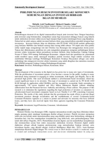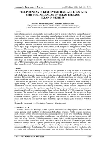 Tendhyanto, Michelle Ariel and Adam, Richard Chandra (2023) PERLINDUNGAN HUKUM INVESTOR SELAKU KONSUMEN SEHUBUNGAN DENGAN INVESTASI BERBASIS IKLAN DI MEMILES. Community Development Journal.