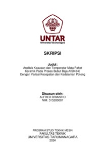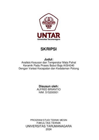 Briantio, Alfred (2024) Analisis keausan dan temperatur mata pahat keramik pada proses bubut baja AISI4340 dengan varisasi kecepatan dan kedalaman potong (TM - 1384). Skripsi thesis, Universitas Tarumanagara.