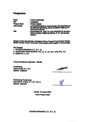 Santoso, Yudha (2024) Uji eksperimental rancangan jaw gripper OP 30 dengan material onyx-carbon fiber di PT. Matahari Megah (TM - 1387). Skripsi thesis, Universitas Tarumanagara.
