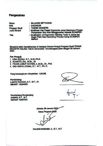 Setyawan, Billiang (2024) Modifikasi alat panjat ergonomis untuk membantu proses pemanenan nira aren menggunakan metode Scamper (T. Ind - 853). Skripsi thesis, Universitas Tarumanagara.