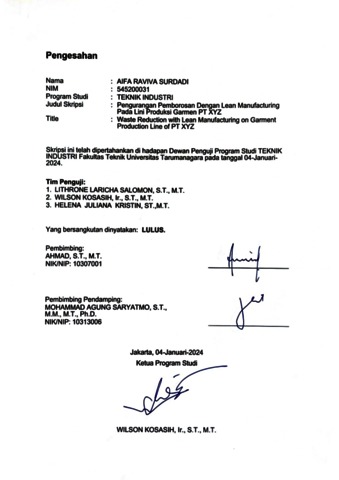 Surdadi, Aifa Raviva (2024) Pengurangan pemborosan dengan Lean Manufacturing pada lini produksi garmen PT. CYZ (T. Ind - 855). Skripsi thesis, Universitas Tarumanagara.