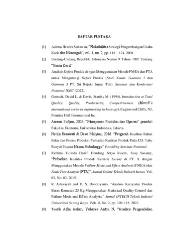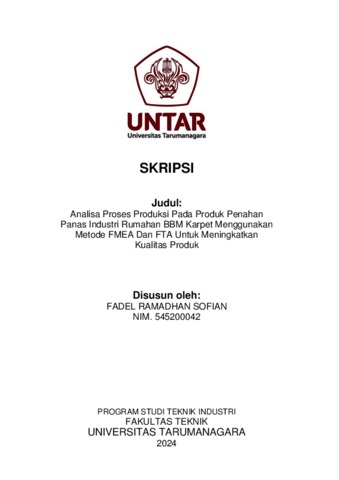 Sofian, Fadel Ramadhan (2024) Analisa proses produksi pada produk penahan panas industri rumahan BBM karpet menggunakan metode FMEA dan FTA untuk meningkatkan kualitas produk (T. Ind - 863). Skripsi thesis, Universitas Tarumanagara.