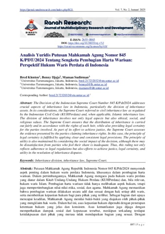 Klenten, Bred and Djaja, Benny and Sudirman, Maman (2025) Analisis Yuridis Putusan Mahkamah Agung Nomor 845 K/PDT/2024 Tentang Sengketa Pembagian Harta Warisan: Perspektif Hukum Waris Perdata di Indonesia. Ranah Research: Journal of Multidisciplinary Research and Development, 7 (2).