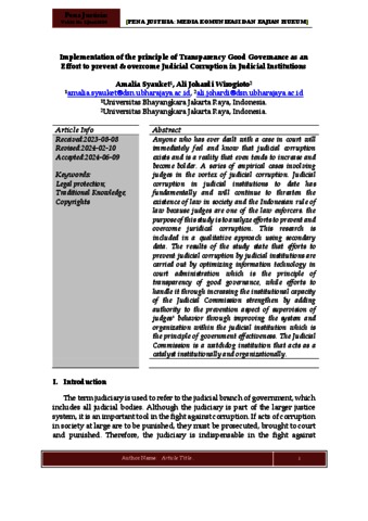 Syauket, Amalia and Wirogioto, Ali Johardi (2024) Implementation of the principle of Transparency Good Governance as an Effort to prevent & overcome Judicial Corruption in Judicial Institutions. Pena Justisia, 21 (2).