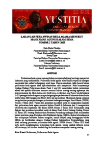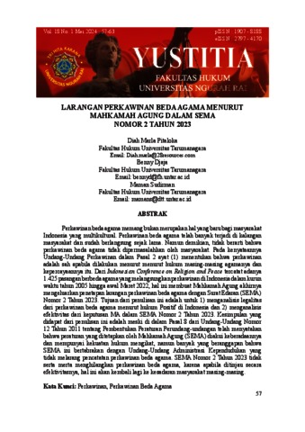 Pitaloka, Diah Marla and Djaja, Benny and Sudirman, Maman (2024) LARANGAN PERKAWINAN BEDA AGAMA MENURUT MAHKAMAH AGUNG DALAM SEMA NOMOR 2 TAHUN 2023. Yustitia.
