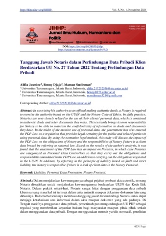 Jasmine, Alifia and Djaja, Benny and Sudirman, Maman (2024) Tanggung Jawab Notaris dalam Perlindungan Data Pribadi Klien Berdasarkan UU No. 27 Tahun 2022 Tentang Perlindungan Data Pribadi. JIHHP Jurnal Ilmu Hukum Humaniora dan Politik.