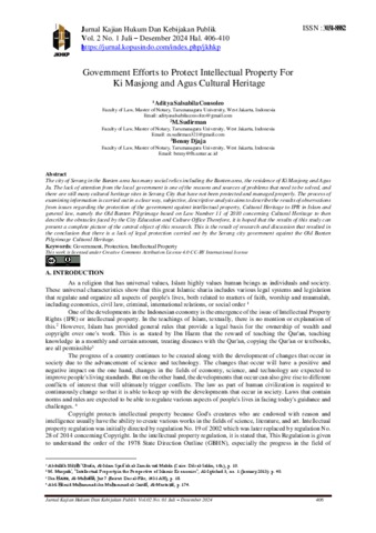 Consoleo, Aditya Salsabila and Sudirman, Maman and Djaja, Benny Government Efforts to Protect Intellectual Property For Ki Masjong and Agus Cultural Heritage. Jurnal Kajian Hukum Dan Kebijakan Publik.
