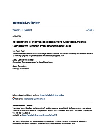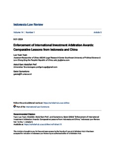 Luo, Yuan Yuan and Abdullah, Abdul Gani and Soemartono, Gatot P. ENFORCEMENT OF INTERNATIONAL INVESTMENT ARBITRATION AWARDS: COMPARATIVE LESSONS FROM INDONESIA AND CHINA. Indonesia Law Review.