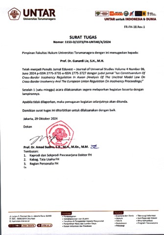 Andrian, Andrian and Gunardi, Lie (2024) IUS CONSTITUENDUM OF CROSS-BORDER INSOLVENCY REGULATION IN ASEAN (ANALYSIS OF THE UNCITRAL MODEL LAW ON CROSS- BORDER INSOLVENCY AND THE EUROPEAN UNION REGULATION ON INSOLVENCY PROCEEDINGS). Eduvest – Journal of Universal Studies.