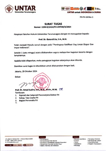 Hartono, Evelyn and Gunardi, Lie and Putra, Moody Rizqy Syailendra (2023) PENTINGNYA RATIFIKASI CISG UNTUK EKSPOR DAN IMPOR INDONESIA1. NUSANTARA: Jurnal Ilmu Pengetahuan Sosial, 10 (6).