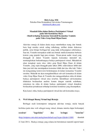 Aktivitas remaja di dalam dunia maya memberikan ruang dan bentuk baru bagi mereka untuk saling terhubung, terlibat dalam diskursus publik, serta belajar berbagai hal yang tidak terbayangkan sebelumnya. Saat ini, Youtube merupakan salah satu bentuk media komunitas berbasis konten yang populer bagi para remaja. Pesan-pesan audio visual yang diunggah di dalam Youtube kepada komunitas interaktif ini, memungkinkan berkembangnya budaya partisipatori virtual. Makalah ini akan mengkaji suatu situs video grup Band Hijau Daun di dalam Youtube, yang sejak diunggah pada tahun 2008, telah diakses lebih dari lima juta kali dan mendapatkan komentar lebih dari dua ribu kali. Video ini mengundang kontroversi berkelanjutan di dalam komunitas Youtube tersebut. Makalah ini akan mengidentifikasi sub-sub komunitas di dalam video Grup Hijau Daun di Youtube dan menggambarkan etika di dalam budaya partisipatori virtual situs tersebut. Identifikasi sub-komunitas dilakukan berdasarkan analisis konten dengan statistik sederhana, sementara itu etika di dalam budaya partisipatori virtual dianalisis berdasarkan pemaknaan terhadap komentar-komentar yang disampaikan.