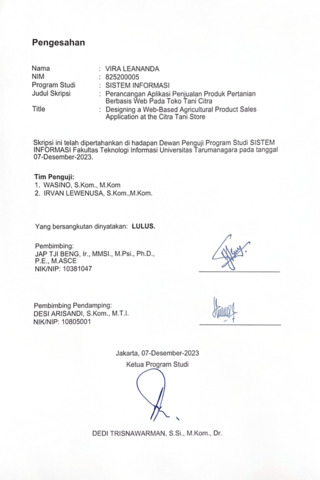 Leananda, Vira (2023) Perancangan aplikasi penjualan produk pertanian berbasis web pada toko Tani Citra. Skripsi thesis, Universitas Tarumanagara.