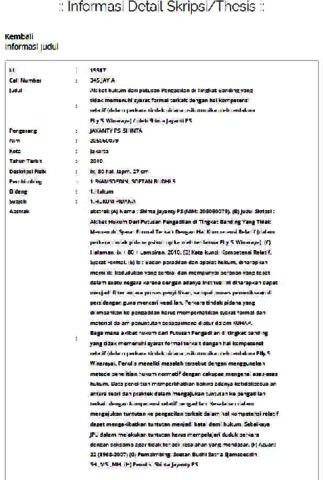 (A) Nama : Shinta Jayanty PS (NIM: 205060079). (B) Judul Skripsi : Akibat Hukum Dari Putusan Pengadilan di Tingkat Banding Yang Tidak Memenuhi Syarat Formal Terkait Dengan Hal Kompetensi Relatif (dalam perkara tindak pidana psikotropika oleh terdakwa Elly S. Winaraya). (C) Halaman: ix + 80 + Lampiran, 2010. (D) Kata kunci: Kompetensi Relatif, Syarat Formal. (E) Isi: Badan peradilan dan aparat hukum, diharapkan memiliki kedudukan yang sentral dan mempunyai peranan yang tepat dalam suatu negara karena dengan adanya institusi ini diharapkan dapat menjadi filter antara proses penyidikan, sampai proses pemeriksaan di persidangan guna mencari keadilan. Perkara tindak pidana yang dilimpahkan ke pengadilan harus memperhatikan syarat formal dan material dalam penuntutan sebagaimana diatur dalam KUHAP. Bagaimana akibat hukum dari Putusan Pengadilan di tingkat banding yang tidak memenuhi syarat formal terkait dengan hal kompetensi relatif (dalam perkara tindak pidana psikotropika oleh terdakwa Elly S. Winaraya). Penulis meneliti masalah tersebut dengan menggunakan metode penelitian hukum normatif dengan cakupan mengenai asas-asas hukum. Data penelitian memperlihatkan bahwa adanya ketidaksesuaian antara teori dan praktek dalam mengajukan tuntutan ke pengadilan terkait dengan kompetensi relatif pengadilan. Kesalahan dalam mengajukan tuntutan ke pengadilan terkait dalam hal kompetensi relatif dapat mengakibatkan tuntutan menjadi batal demi hukum. Sebaiknya JPU dalam melakukan tuntutan harus mempelajari duduk perkara dengan seksama agar tidak terjadi kesalahan yang mendasar. (F) Acuan: 22 (1968-2007) (G) Pembimbing: Soetan Budhi Satria Sjamsoeddin SH.,MSi.,MH. (H) Penulis: Shinta Jayanty PS