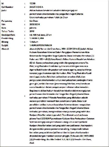 Kata Kunci : Akibat Hukum Kesalahan Advokat (E) Isi : Suatu perkawinan yang telah dilangsungkan antara Tn. Phie,Teng Phui alias Rusdi dan ny.Tina sesuai dengan tata cara Agama Buddha dan dinyatakan sah secara agama, tetapi akhirnya tercatat juga di catatan sipil. Kemudian, Phie Teng Phui alias Rusdi meninggal, maka dilakukan perkawinan tersebut dilakukan pengurusan akta kematian untuk menyelesaikan pembagian harta gono gini, melalui bantuan jasa seorang Advokat, tetapi terdapat suatu kesalahan dalam pengajuan permohonan akte kematian. Bagaimana akibat hukum kesalahan Advokat dalam mengajukan permohonan akte kematian ke Pengadilan Negeri Jakarta Utara terhadap pemohon ? Metode Penelitian yang dilakukan adalah metode penelitian normatif dan penelitian empiris. Data hasil penelitian : akibat hukum kesalahan Advokat dalam mengajukan permohonan akte kematian ke Pengadilan Negeri Jakarta Utara terhadap pemohon, menghasilkan amar putusan yang salah dan Kutipan Akte Kematian juga salah.Tina dikenai tuduhan kasus pidana Pasal 263 KUHP pemalsuan Kutipan Akta Perkawinan Catatan Sipil dan mengajukan permohonan ulang untuk memperbaiki Kutipan Akta Kematian dari yang salah menjadi benar. Kesimpulan: dengan melalui proses permohonan ulang, memperbaiki tahun kematian yang salah menjadi benar dan kutipan akta kematian dikoreksi dengan memberi catatan pinggir. (F) Acuan : 23 ( 1976-2009 ) (G) Pembimbing : Ibu Mia Hadiati, S.H., M.H. (H) Penulis : Lie Chen, Amd.