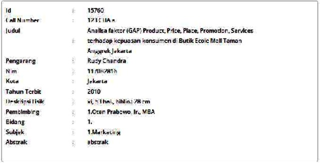 Chandra, Rudy (2010) Analisa faktor (GAP) Product, Price, Place, Promotion, Services terhadap kepuasan konsumen di Butik Ecole Mall Taman Anggrek Jakarta. Informasi Detail Skripsi. p. 53. ISSN 117082816