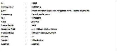 Octavia, Paundrine (2010) Analisa tingkat kepuasan pengguna mobil Toyota di Jakarta. Informasi Detail Skripsi/Thesis. p. 124. ISSN 117082010