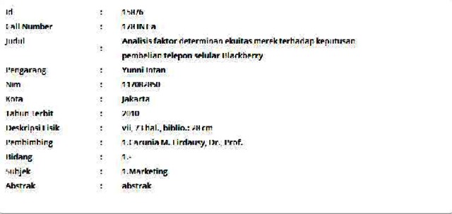 Intan, Yunni (2010) Analisis faktor determinan ekuitas merek terhadap keputusan pembelian telepon selular Blackberry. Informasi Detail Skripsi/Thesis. p. 73. ISSN 117082850