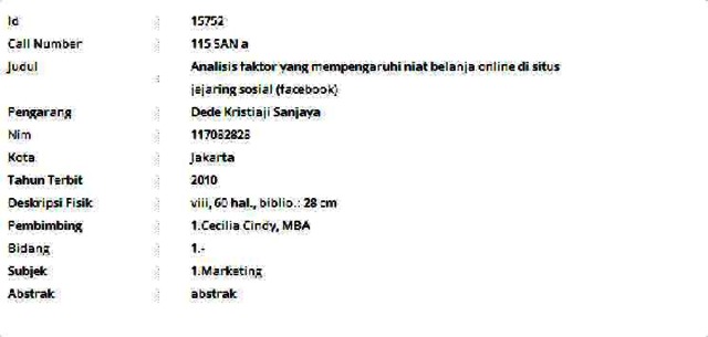 Sanjaya, Dede Kristiaji (2010) Analisis faktor yang mempengaruhi niat belanja online di situs jejaring sosial (facebook). Informasi Detail Skripsi/Thesis. p. 60. ISSN 117082828