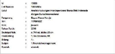 Masto Hardja, Bagus (2010) Analisis hubungan interdependensi Bursa Efek Indonesia dengan Bursa Internasional. Informasi Detail Skripsi/Thesis. p. 74. ISSN 117091027