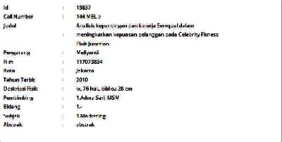 Meliyanti, Meliyanti (2010) Analisis kepentingan dan kinerja Servqual dalam meningkatkan kepuasan pelanggan pada Celebrity Fitness Pluit Junction. Informasi Detail Skripsi/Thesis. p. 76. ISSN 117073834