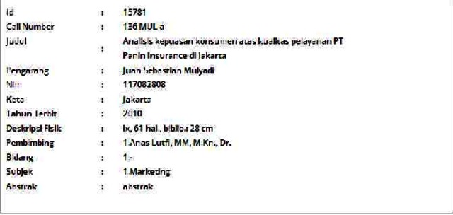 Mulyadi, Juan Sebastian (2010) Analisis kepuasan konsumen atas kualitas pelayanan PT Panin Insurance di Jakarta. Informasi Detail Skripsi/Thesis. p. 61. ISSN 117082808
