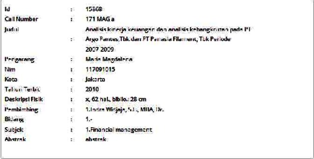 Magdalena, Maria (2010) Analisis kinerja keuangan dan analisis kebangkrutan pada PT Argo Pantes,Tbk dan PT Panasia Filament, Tbk Periode 2007-2009. Informasi Detail Skripsi/Thesis. p. 62. ISSN 117091015