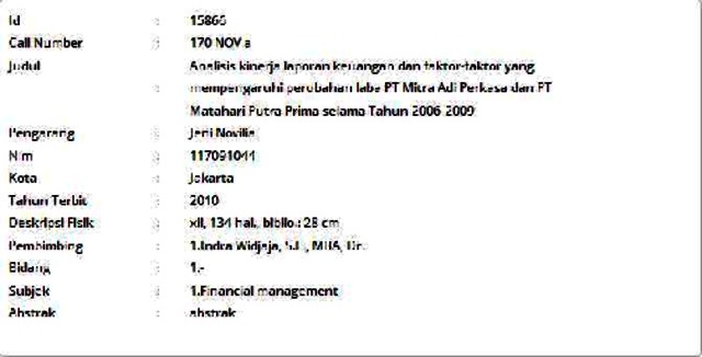 Novilia, Jeni (2010) Analisis kinerja laporan keuangan dan faktor-faktor yang mempengaruhi perubahan laba PT Mitra Adi Perkasa dan PT Matahari Putra Prima selama Tahun 2006-2009. Informasi Detail Skripsi/Thesis. p. 134. ISSN 117091044