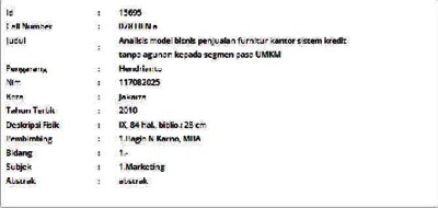 Hendrianto, Hendrianto (2010) Analisis model bisnis penjualan furnitur kantor sistem kredit tanpa agunan kepada segmen pasa UMKM. Informasi Detail Skripsi/Thesis. p. 84. ISSN 117082025