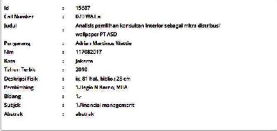 Martinus Wattie, Adrian (2010) Analisis pemilihan konsultan interior sebagai mitra distribusi wallpaper PT ASD. Informasi Detail Skripsi/Thesis. p. 81. ISSN 117082017