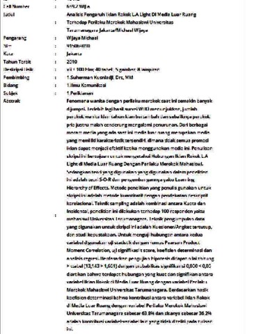 Wijaya, Michael (2010) Analisis Pengaruh Iklan Rokok L.A Light Di Media Luar Ruang Terhadap Perilaku Merokok Mahasiswi Universitas Tarumanagara Jakarta. Informasi Detail Skripsi/Thesis. p. 100. ISSN 915069010