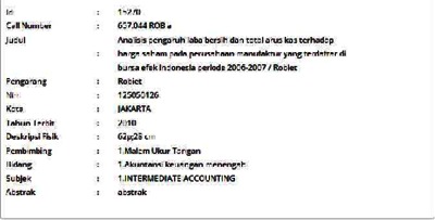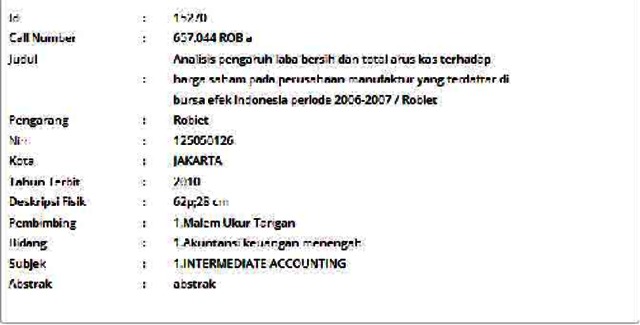 Robiet, Robiet (2010) Analisis pengaruh laba bersih dan total arus kas terhadap harga saham pada perusahaan manufaktur yang terdaftar di bursa efek indonesia periode 2006-2007. Informasi Detail Skripsi/Thesis. p. 62. ISSN 117091053