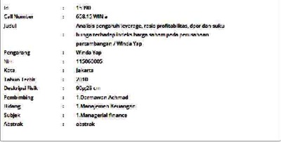 Yap, Winda (2010) Analisis pengaruh leverage, rasio profitabilitas, dpor dan suku bunga terhadap indeks harga saham pada perusahaan pertambangan. Informasi Detail Skripsi/Thesis. p. 90. ISSN 115060005